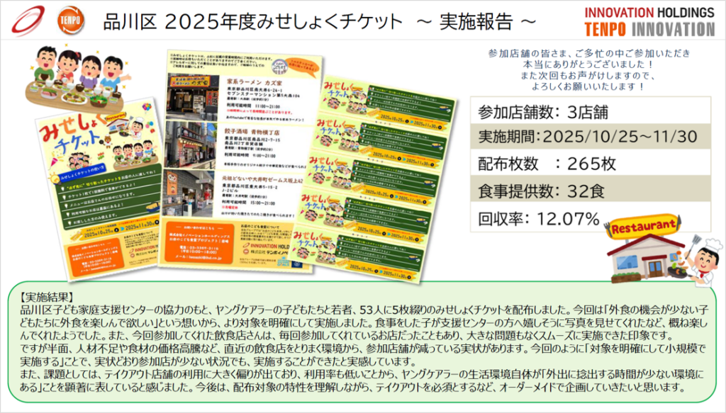 今年で3回目の開催となる品川区で、子ども家庭支援センターの協力のもと、親御さんやきょうだいなどの家族の介護をしているヤングケアラーの子どもたちと若者、53人に5枚綴りのみせしょくチケットを配布しました。チケットの活動としては、外食の経験が少ない環境の子どもたちに対象をしぼりこんだ、初めての試みです。