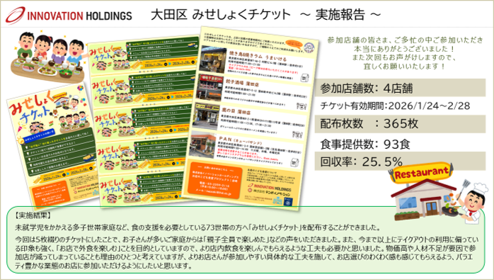 今年で4回目の開催となる大田区で、大田区社会福祉協議会の協力のもと、ご自宅へ食材などをボランティアの方が届ける「ほほえみごはん(子ども宅食事業)」の多子世帯を中心とした73世帯に、5枚綴りのみせしょくチケットを配布していただきました。